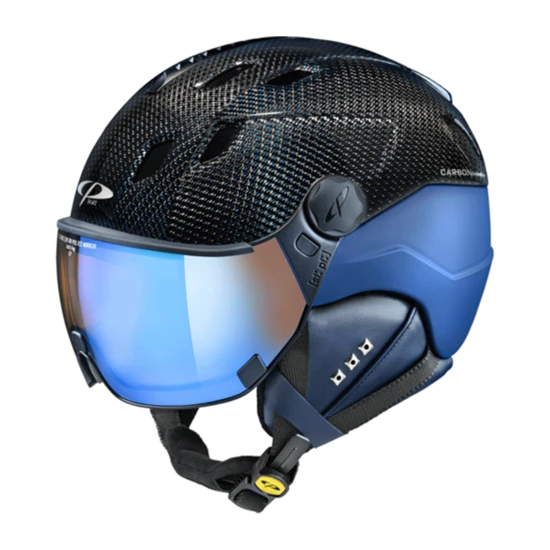 De CP Corao+ Skihelm met Vizier blue carbon shiny / blue soft touch (zwart-blauw) met meekleurend en polariserend vizier, kunnen we direct uit voorraad snel leveren bij TopSnowShop!